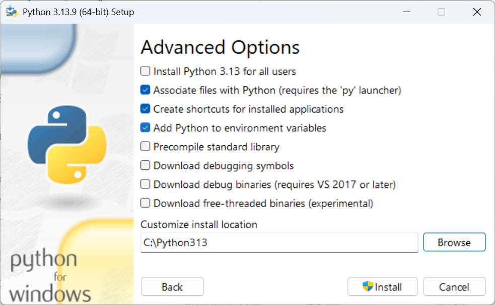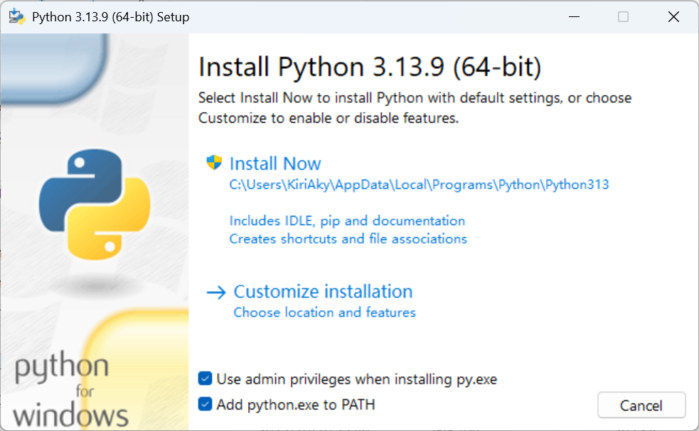 下载好后打开如图2.02所示,勾选用管理员权限安装py和添加到path后,选择 Customize Installation ,随后如图2.03全选,2.04更改安装位置(这个也要记住)后,其余全部默认即可