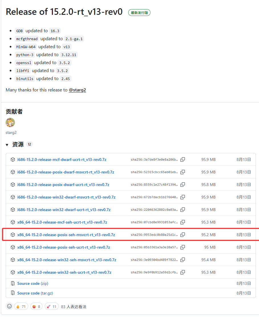 如图1.01所示,无论什么版本,我们使用下载的都是名称为 x86_64-15.2.0-release-posix-seh-msvcrt-rt_vxx-rev0.7z的文件,其中 vxx 表示版本号,例如图中所示的 v13