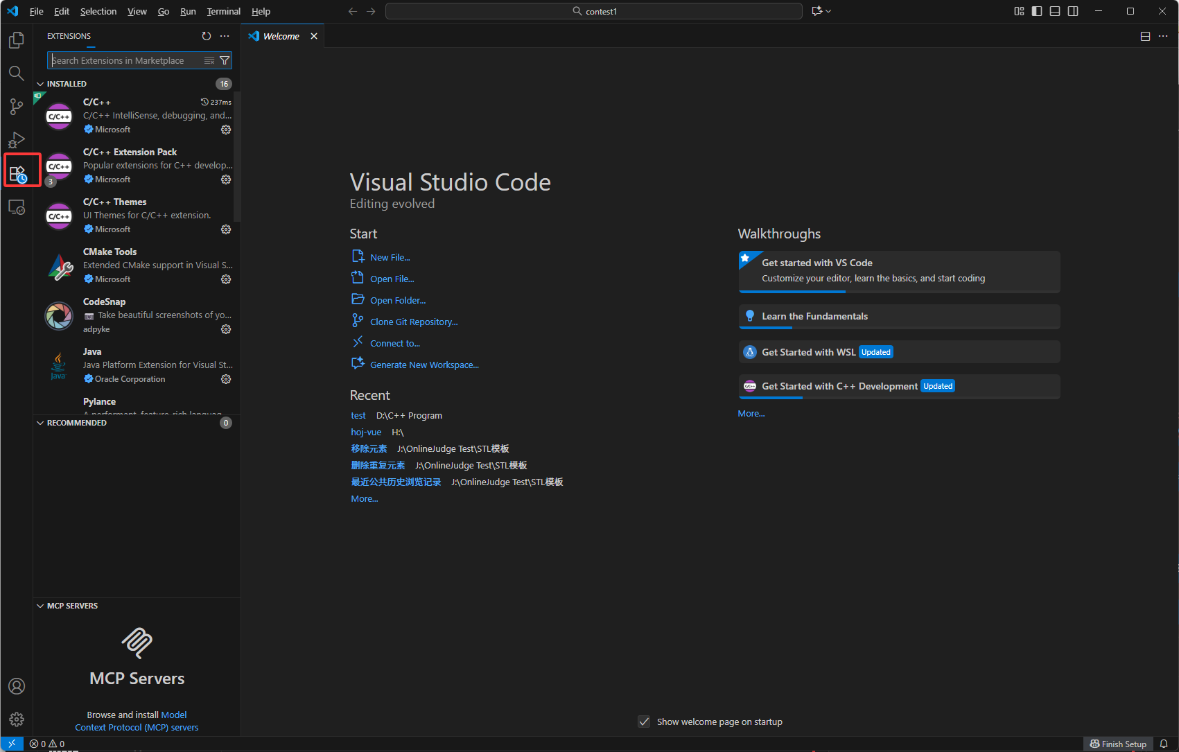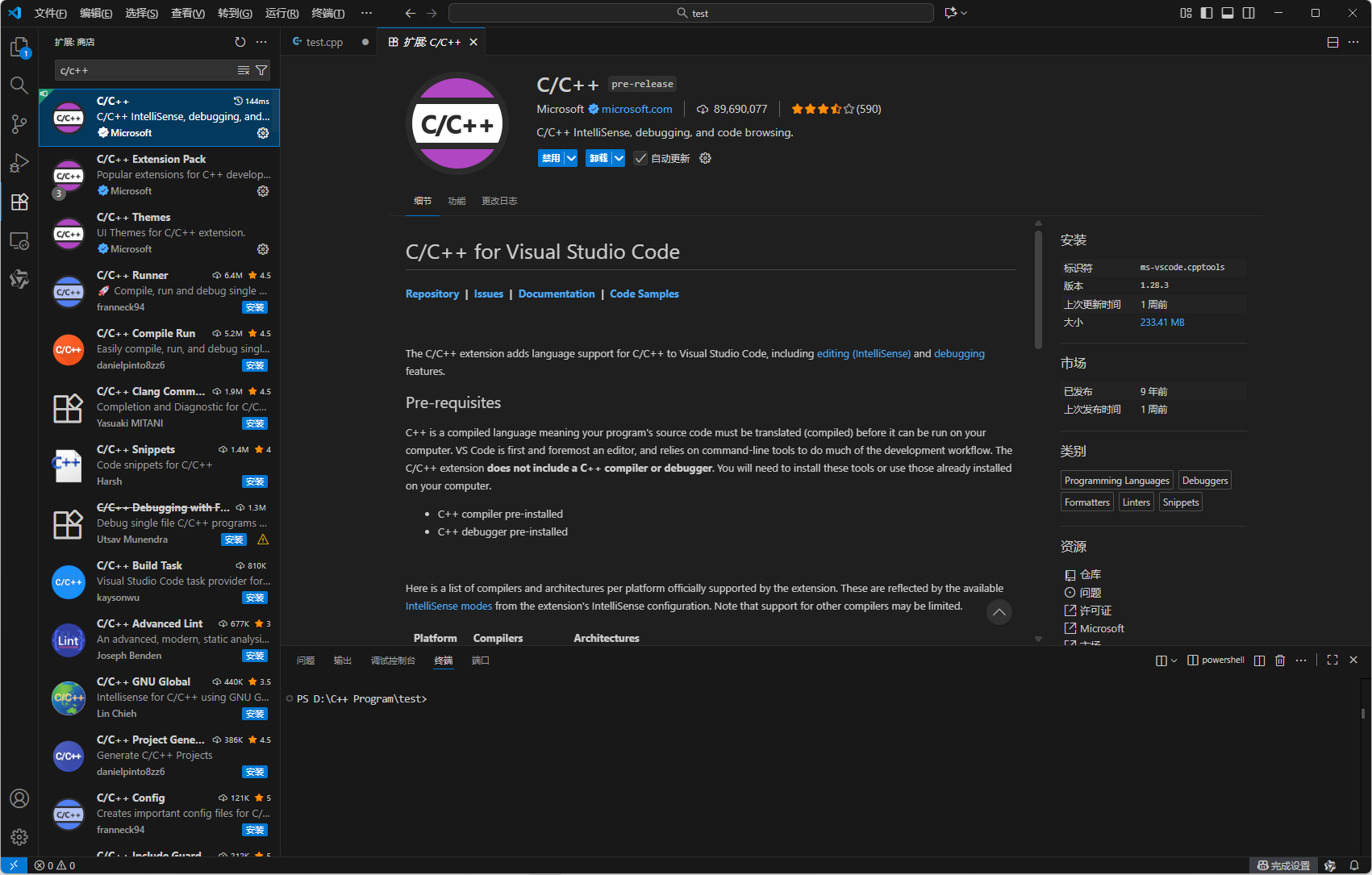 如图1.11,在vscode的插件库里搜索并安装 C/C++ 这个插件。