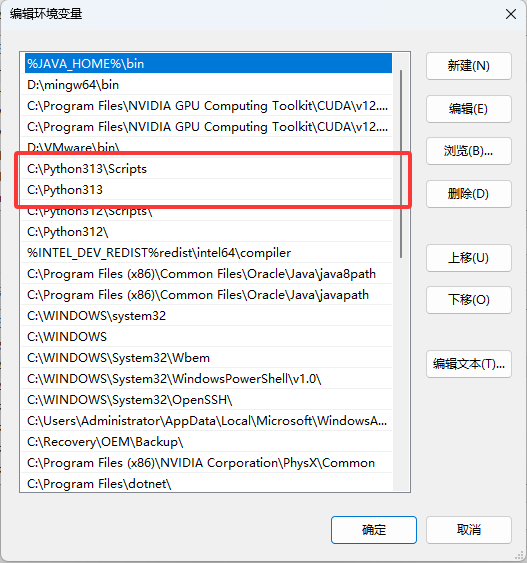 如图2.05~2.08配置好PATH后(其中Scripts是配置python库下载器pip,如安装了旧版本的python,新版本的最好放在旧版本之上,或者直接把旧版本删除,如果不知道如何打开和配置系统环境变量,参看C/C++部分的图1.04~1.10)点击确定保存