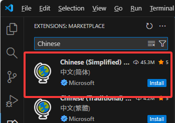 随后如图0.01侧边栏插件库中搜索Chinise,点击install安装