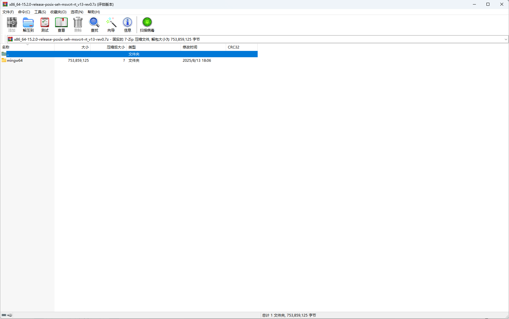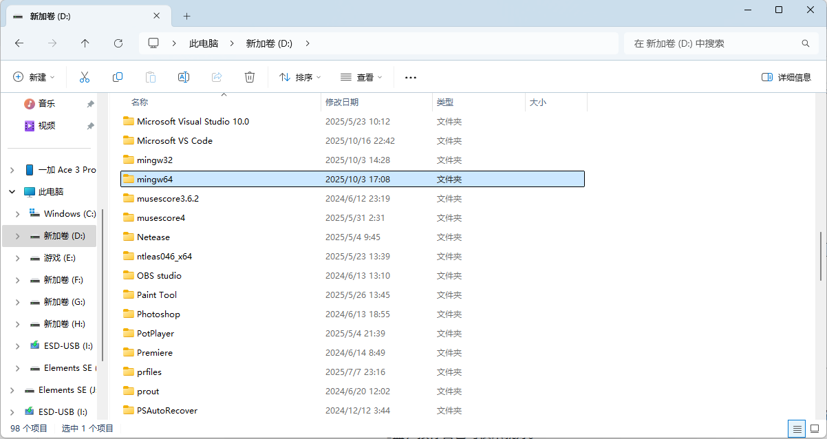 如图1.02所示,打开下载好的压缩包后,里面就只有一个名为mingw64的文件,将其解压出来,我的习惯是这类编译器都塞在D盘,按你自己习惯来就好。