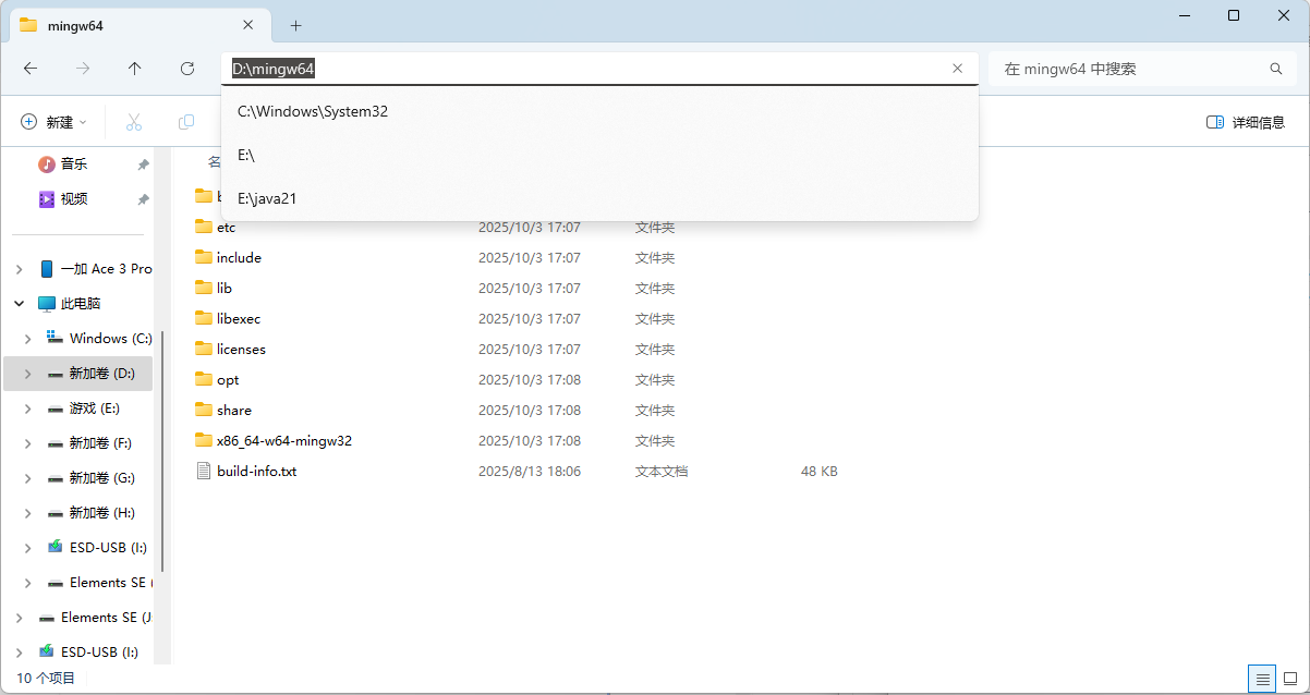 如图1.04所示,进入mingw64文件夹后,复制上方文件路径比如我的 D:\mingw64